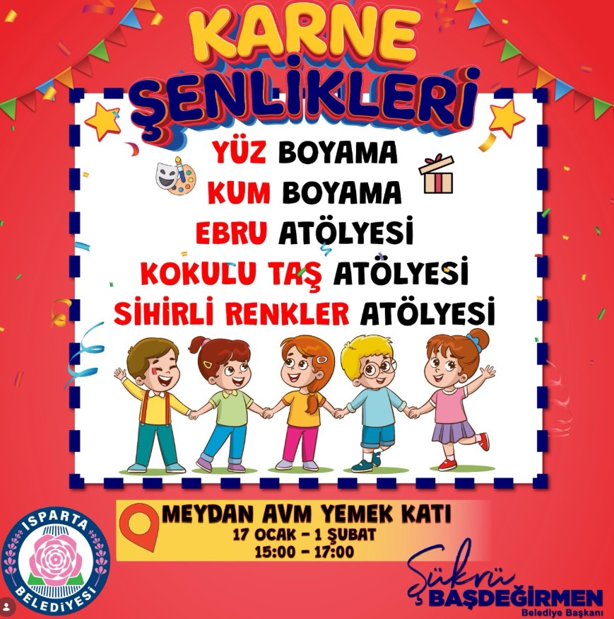 Isparta Belediye Başkanı Şükrü Başdeğirmen, yarıyıl tatili dolayısıyla düzenlenecek Karne Şenlikleri’ne tüm çocukları ve ailelerini davet etti.