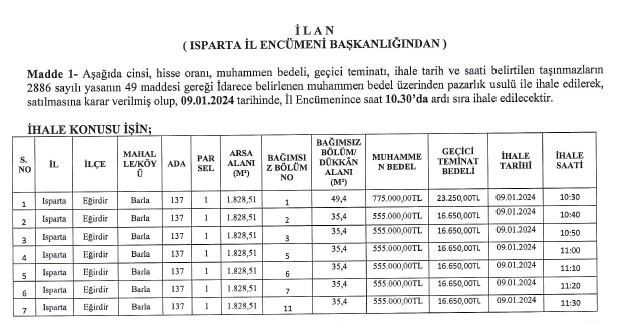 Isparta İl Özel İdaresi 7 adet dükkanı satışa sunuyor. Söz konusu taşınmazlar açık teklif usulü ile 09.01.2024 tarihinde Isparta İl Özel İdaresi İl Encümenince saat 10:30’da ardı sıra ihale edilecektir.