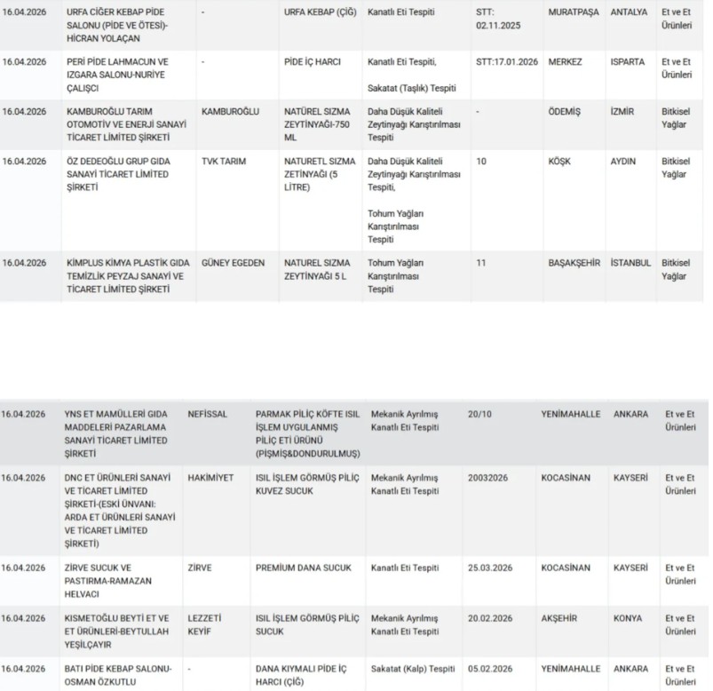 Yapılan incelemelerde; Antalya’nın Muratpaşa ilçesinde bir işletmede Urfa kebapta kanatlı eti kullanıldığı, İzmir’de ise bazı firmaların zeytinyağına düşük kaliteli yağ ve tohum yağı karıştırdığı tespit edildi. Bakanlık, tüketicileri şüpheli ürünler konusunda dikkatli olmaya çağırdı.