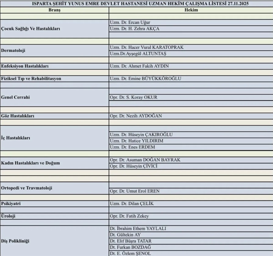 Isparta İl Sağlık Müdürlüğü, 27 Kasım 2025 Perşembe günü Isparta Şehit Yunusemre Devlet Hastanesi’nde görev yapacak uzman doktorların listesini yayımladı. Vatandaşların muayene planlamasını kolaylaştırmak amacıyla paylaşılan listede, ilgili gün polikliniklerde görev alacak hekimlerin isimleri yer alıyor.