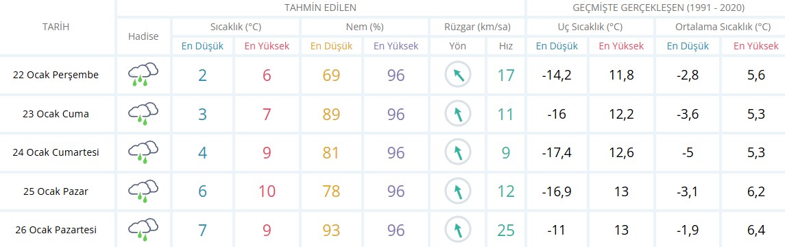 Öte yandan hafta boyunca yağışlı havanın etkili olacağı bildirildi. Perşembe günü yaklaşık 90 milimetre ile haftanın en yoğun yağışının görülmesi beklenirken; çarşamba 2 mm, cuma 63 mm, cumartesi 55 mm, pazar 20 mm, pazartesi 62 mm ve salı günü 65 mm yağış tahmin ediliyor.