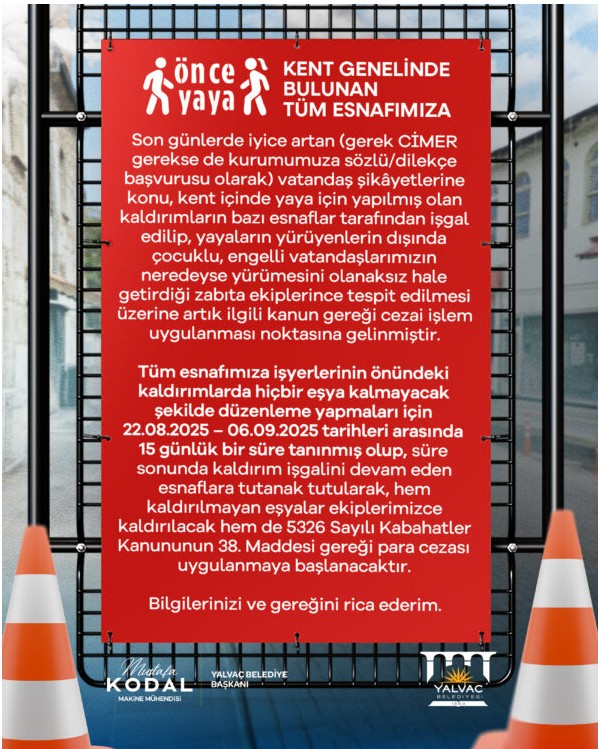 Yalvaç Belediye Başkanı Mustafa Kodal, kentte yaya kaldırımlarını işgal eden esnafa yönelik sosyal medya hesaplarından son uyarısını yaptı. Başkan Kodal, esnafa kurallara uyum sağlamaları için 6 Eylül 2025 tarihine kadar süre tanındığını, bu tarihten sonra cezai işlemlerin uygulanacağını belirtti.